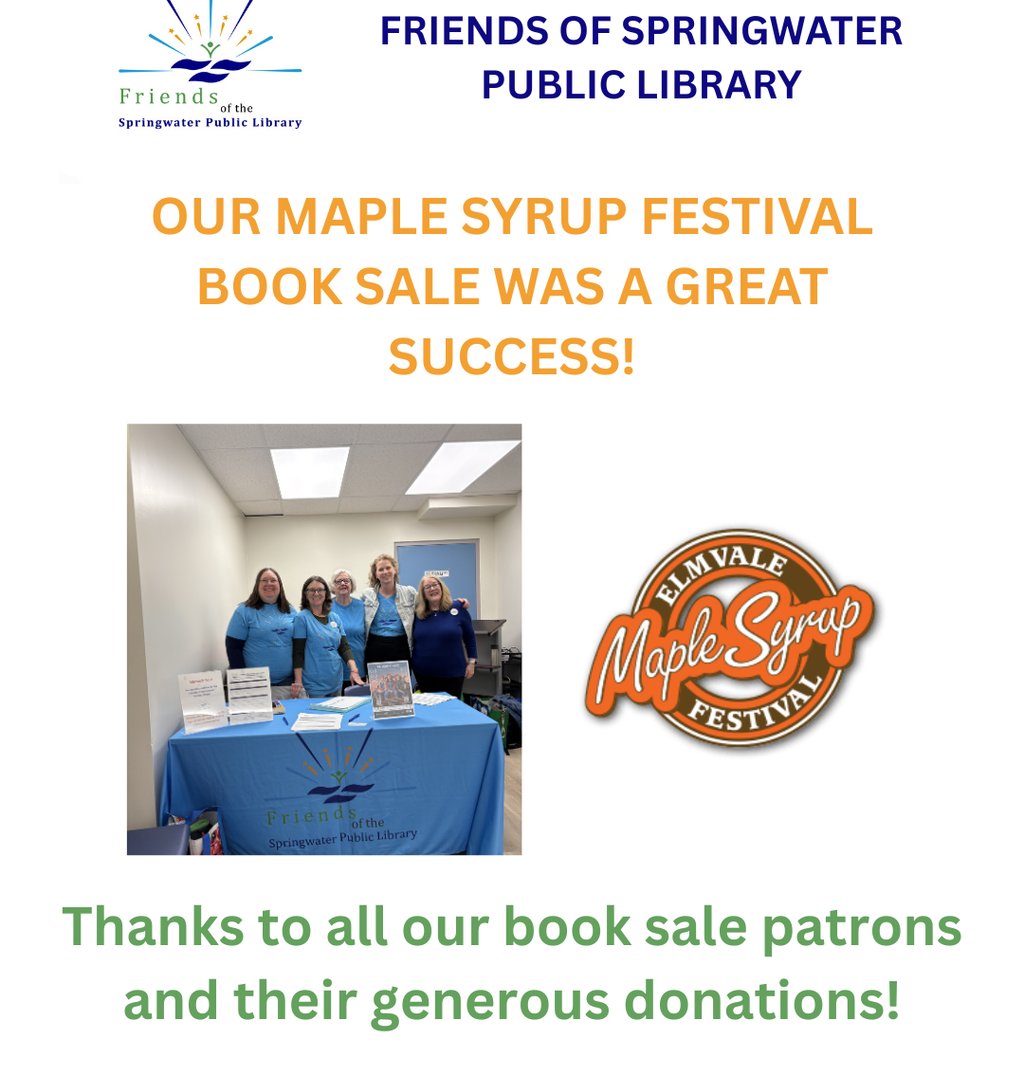a) Maple Syrup Festival: Due to last year’s flooding of the Elmvale Library's lower level, the book sale was moved outdoors. This year the book sale will return to the lower level of the Elmvale Branch. FOSPL members will get early access to the sale.