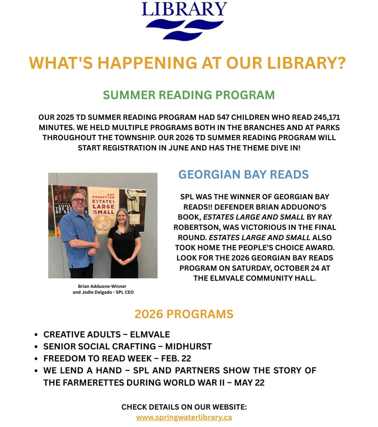 Upcoming Library events include: AI Literacy (April); Battle of the Books (May), We Lend a Hand: The Forgotten Story of the Ontario Farmerette (May); and the Summer Reading Program. Springwater Library is thrilled to be hosting Georgian Bay Reads (Oct) and is seeking nominations for books.