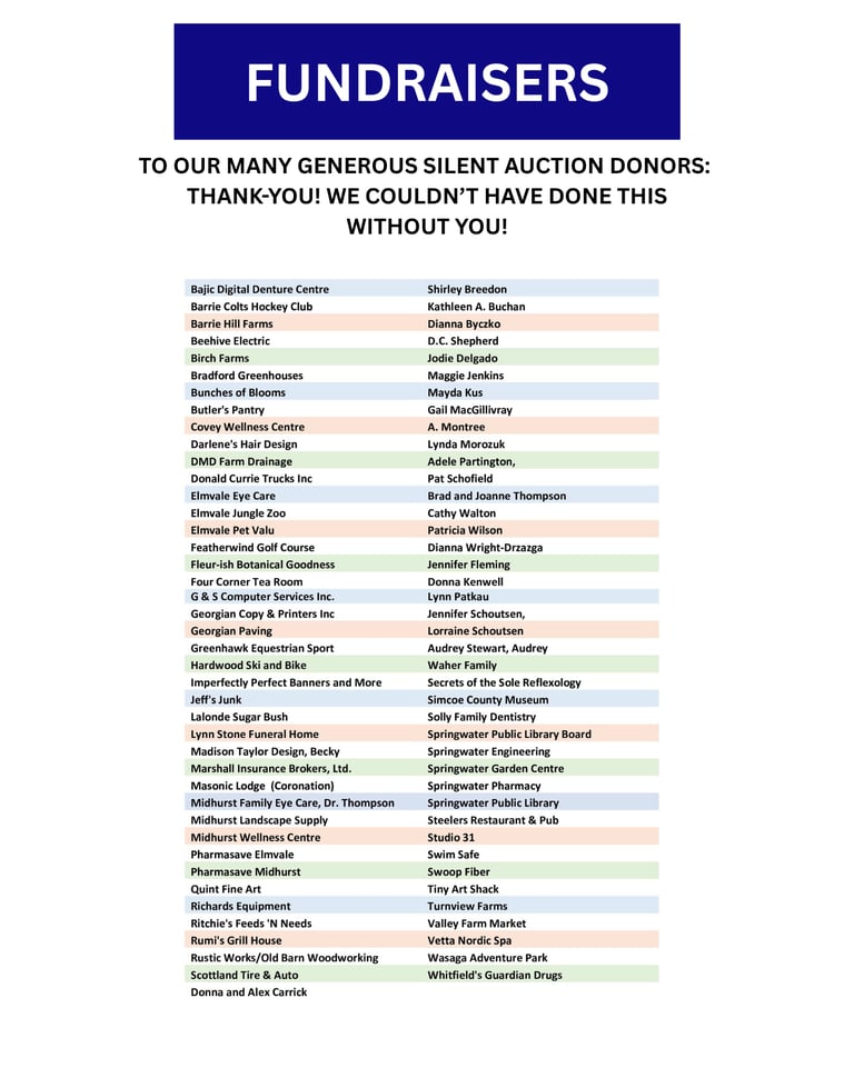Other potential fundraisers were briefly discussed such as: a garden tour (possibly partner with EDGE), Victorian Tea, and a documentary about Ukraine (possibly partner with Springwater Township culture/heritage with a viewing at EDHS).